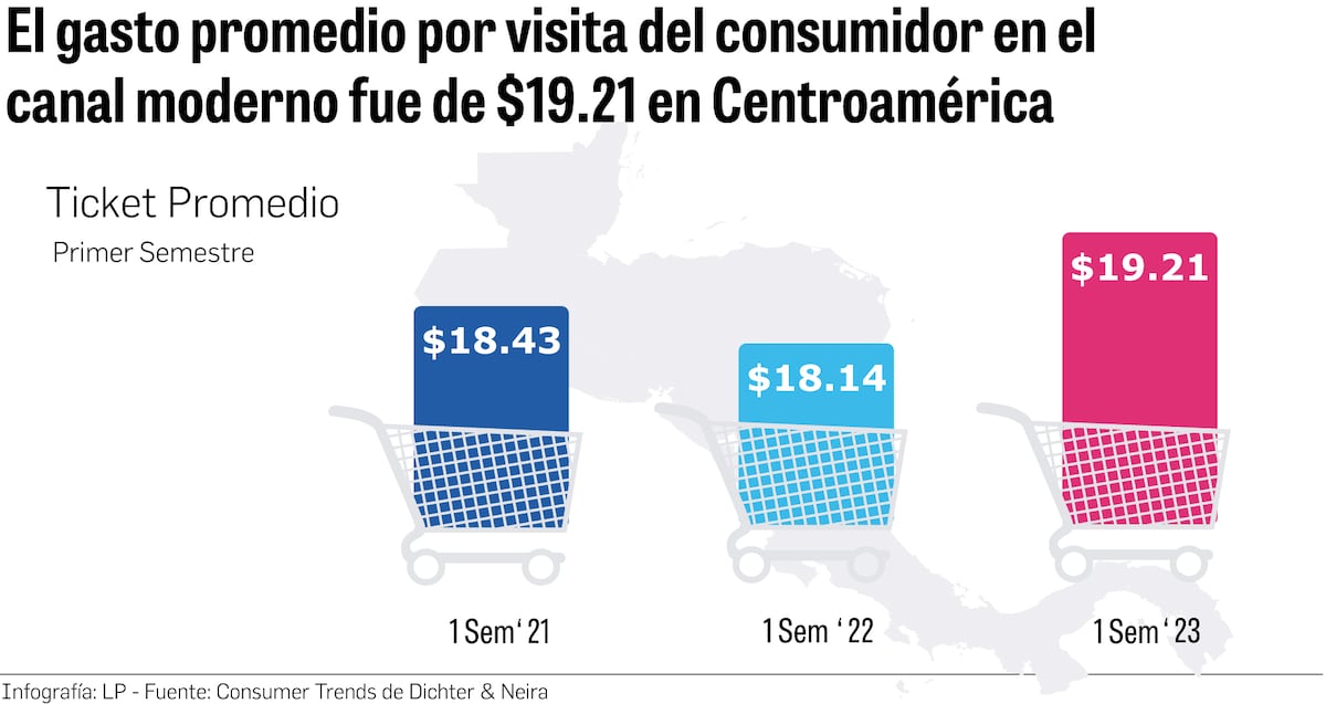 Los consumidores de Centroamérica cada vez que van a un supermercado moderno gastan en promedio 19.21 dólares, lo que significa un incremento de 5.8% con respecto al ticket de compra promedio del primer semestre del año pasado de 18.14 dólares por consumidor. En el primer semestre de 2021 la compra promedio estaba en 18.43 dólares.