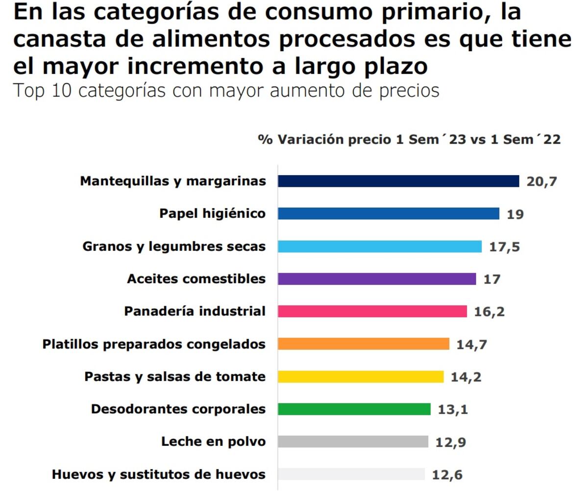 Los productos que más aumentaron de precio en promedio en los supermercados de Centroamérica, durante el primer semestre fueron mantequilla y margarinas (20.7%), papel higiénico (19%), granos y legumbres secas (17.5%), aceites comestibles (17%), panadería industrial (16.2%), platillos preparados congelados (14.7%), pastas y salsas de tomate (14.2%), desodorantes corporales (13.1%), leche en polvo (12.9%) y huevos y sustitutos de huevos (12.6%).
