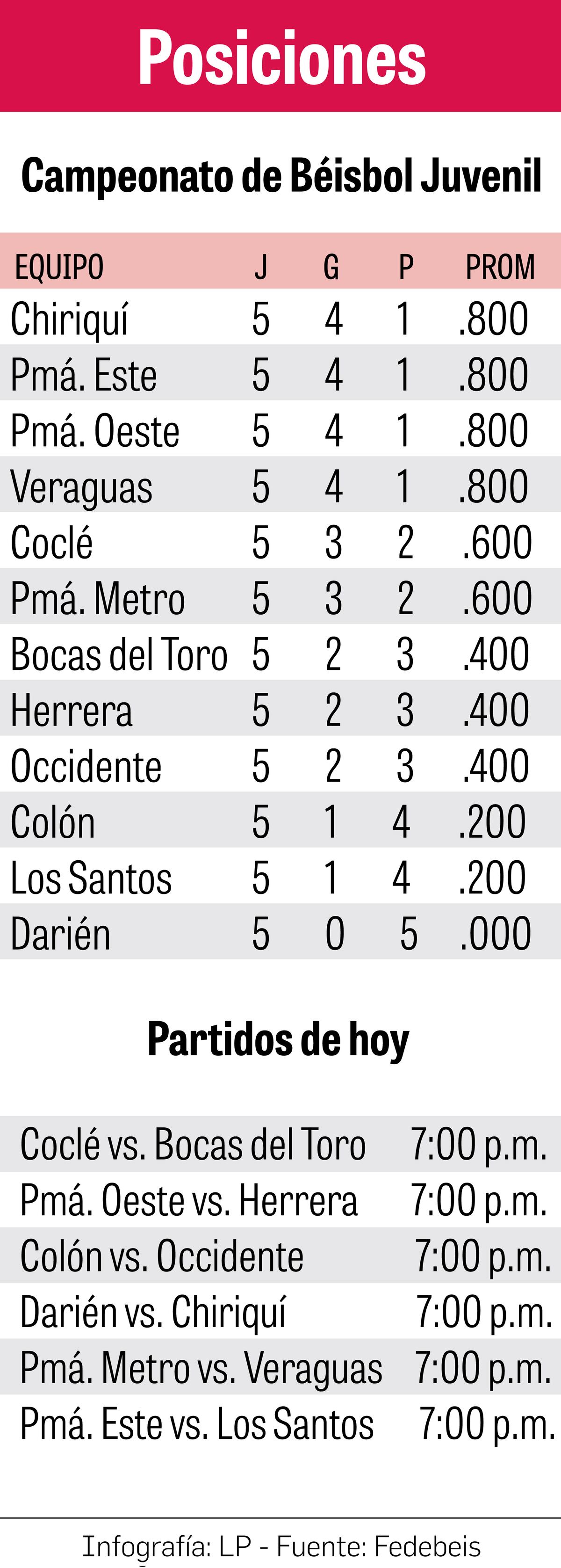 Las novenas de Panamá Oeste, Chiriquí, Veraguas y Panamá Este aparecen este miércoles, 10 de enero, como líderes y con marca de 4-1 en el Campeonato Nacional de Béisbol Juvenil.