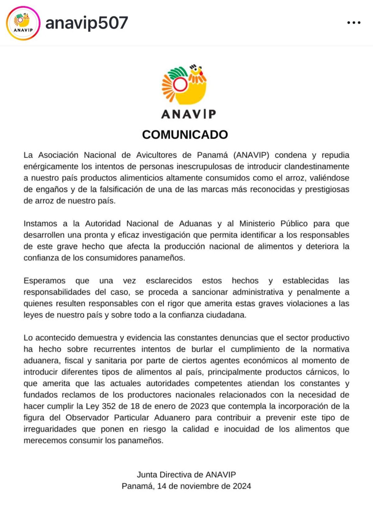 Por su parte, la Asociación Nacional de Avicultores de Panamá (Anavip) instó tanto a la ANA como al MP a realizar una investigación pronta y exhaustiva. “Esperamos que, una vez esclarecidos estos hechos y establecidas las responsabilidades, se sancione administrativa y penalmente a los culpables, con el rigor que estas graves violaciones ameritan”, señaló la organización.
