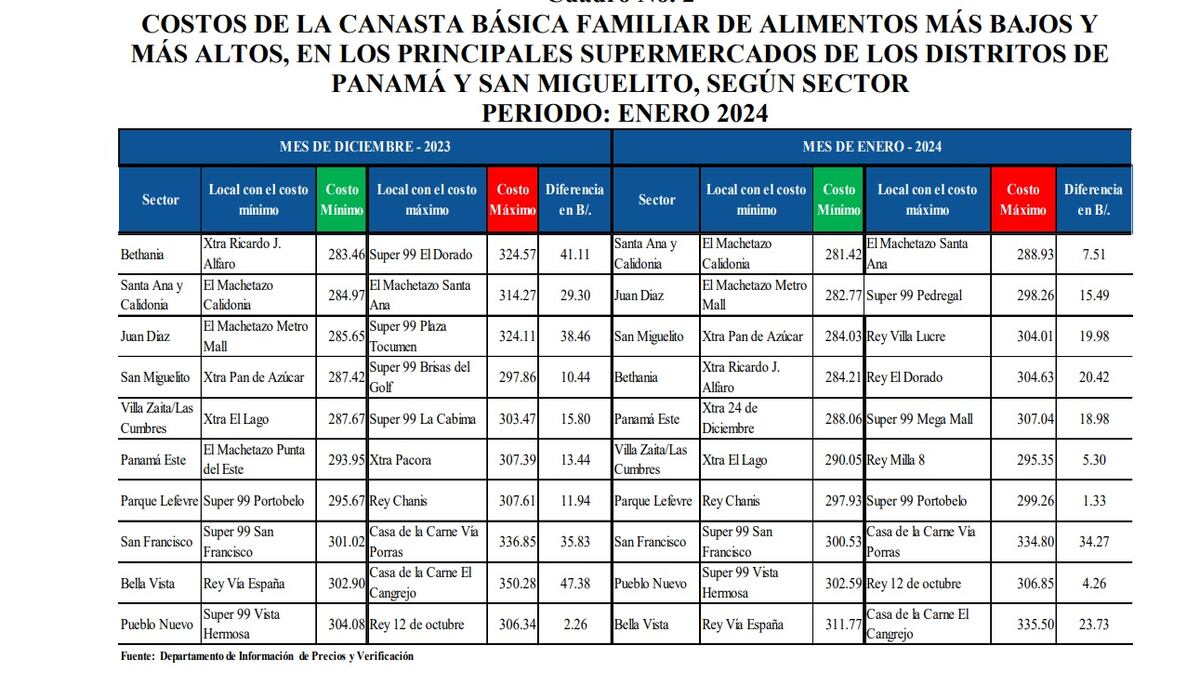 También se registran costos más bajos en supermercados de San Miguelito con un promedio de 284.03 dólares.