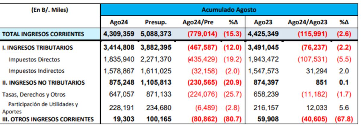 En este contexto, y de acuerdo con los últimos informes de la DGI, los ingresos corrientes acumulados a agosto de 2024 totalizaron $4,309 millones. Esto representa un déficit de $779 millones en comparación con el presupuesto de este año.
