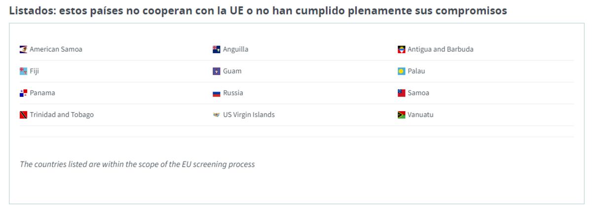 En la lista de países no cooperantes de la UE están 12 países con Panamá: Samoa Americana, Anguila, Antigua y Bermuda, Fiji, Guam, Palau, Rusia, Samoa, Trinidad y Tobago, Islas Vírgenes y Vanuatu.