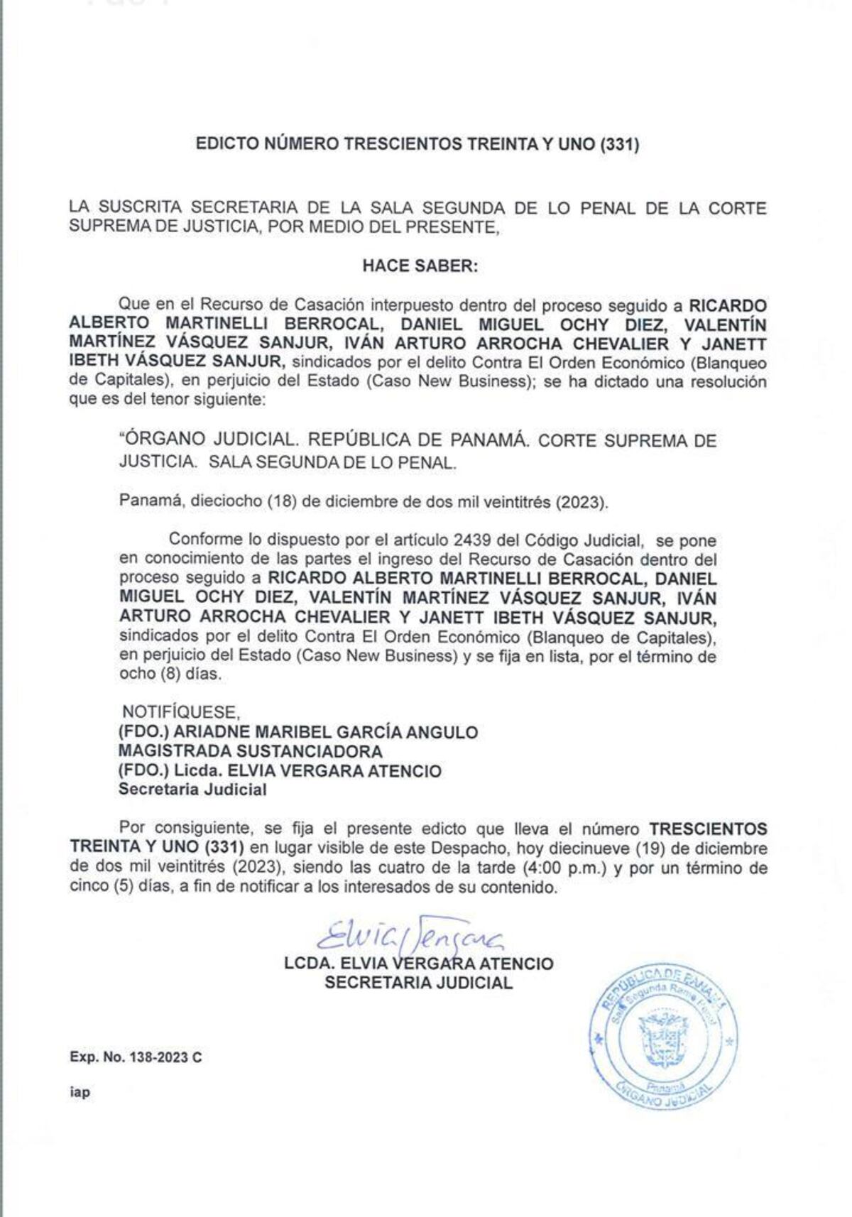 La magistrada Ariadne García será la ponente del recurso de casación penal presentado por el abogado Carlos Carrillo, en favor de Ricardo Martinelli Berrocal, contra la sentencia (ratificada por un juzgado y un tribunal) a 128 meses de prisión y una multa de $19.2 millones por el delito de blanqueo de capitales.