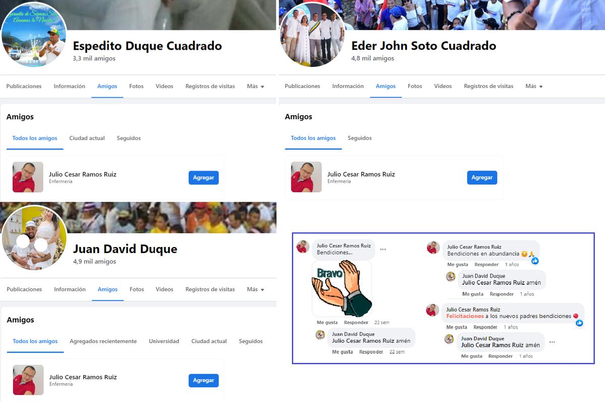 Cuando Ramos trabajaba en el hospital de Puerto Libertador, Eder John Soto, el sucesor de Espedito Duque en la alcaldía, era el administrador de la institución de salud. Fotografías tomadas entre 2016 y 2018 muestran que ambos hombres se conocían y se veían regularmente. Ramos, Duque y Soto son amigos en Facebook. En esa red social, el enfermero ha interactuado con Juan David Duque, el hijo de Espedito Duque, incluso después de su arresto. Un documento obtenido por Forbidden Stories revela que Eder John Soto hizo una declaración a favor de Ramos, su ex empleado según el abogado de Ramos, en la óptica de su juicio.