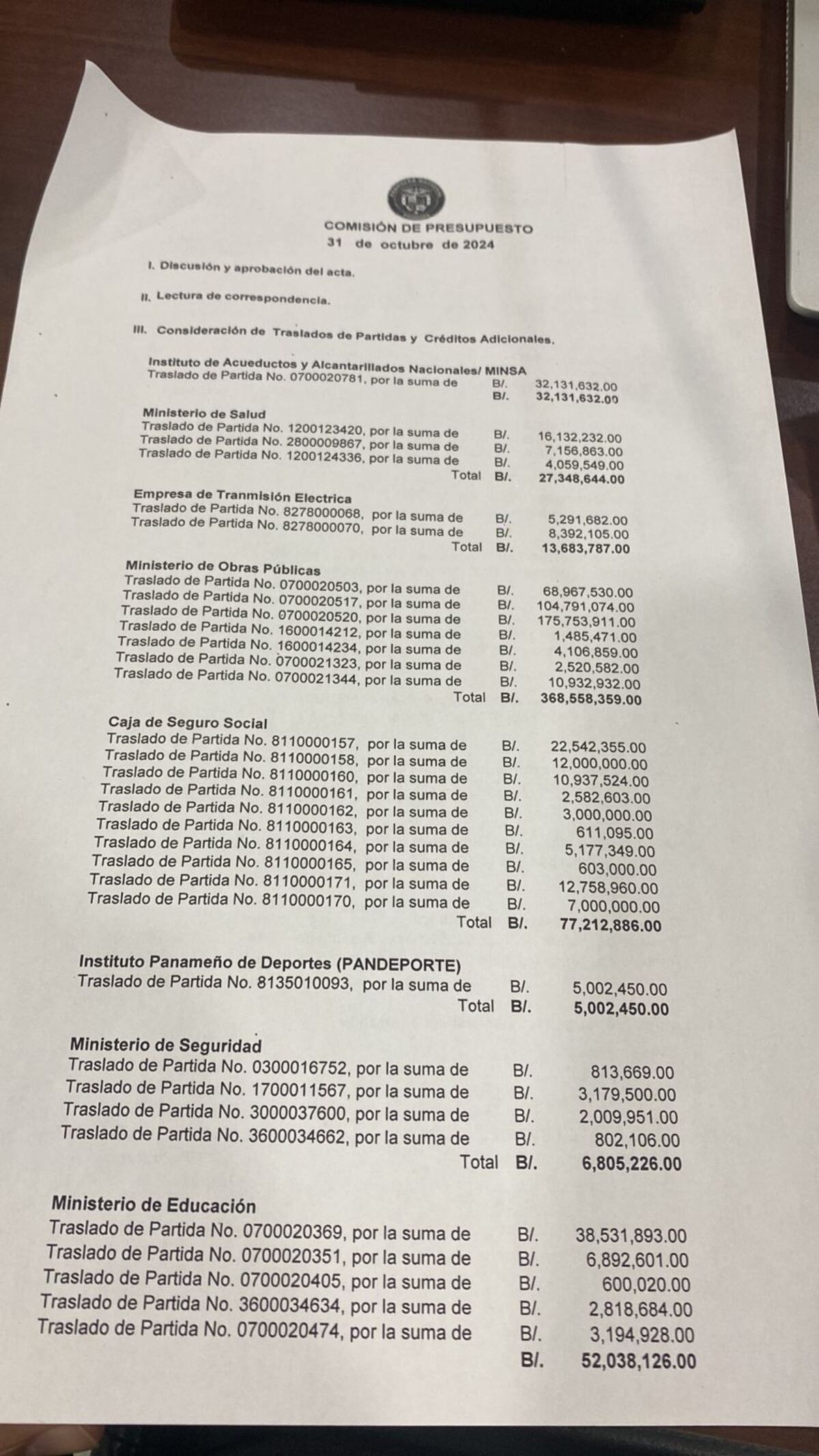 Un total de 20 entidades estaban programadas para presentarse ante la Comisión de Presupuesto para justificar sus solicitudes de traslado de partidas en una jornada que incluiría a sectores como el Ministerio de Obras Públicas (MOP), el Ministerio de Educación (Meduca), el Ministerio de Salud, el Ministerio de Seguridad y la Caja de Seguro Social (CSS).