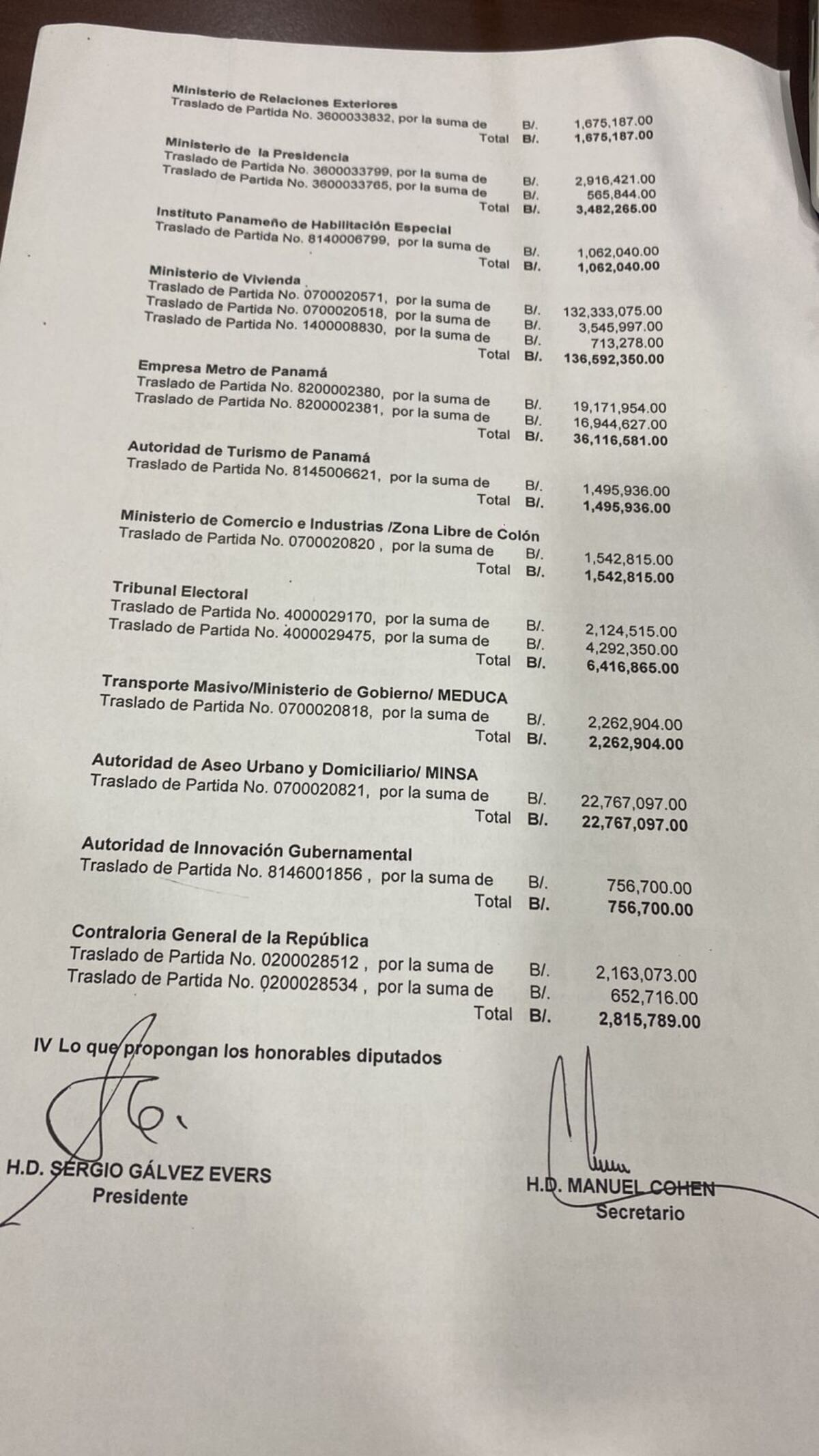 Recientemente, el diario La Prensa informó que la Asamblea Nacional fue notificada por el Ministerio de Economía y Finanzas (MEF) sobre tres traslados específicos de partidas que totalizan $349.3 millones.