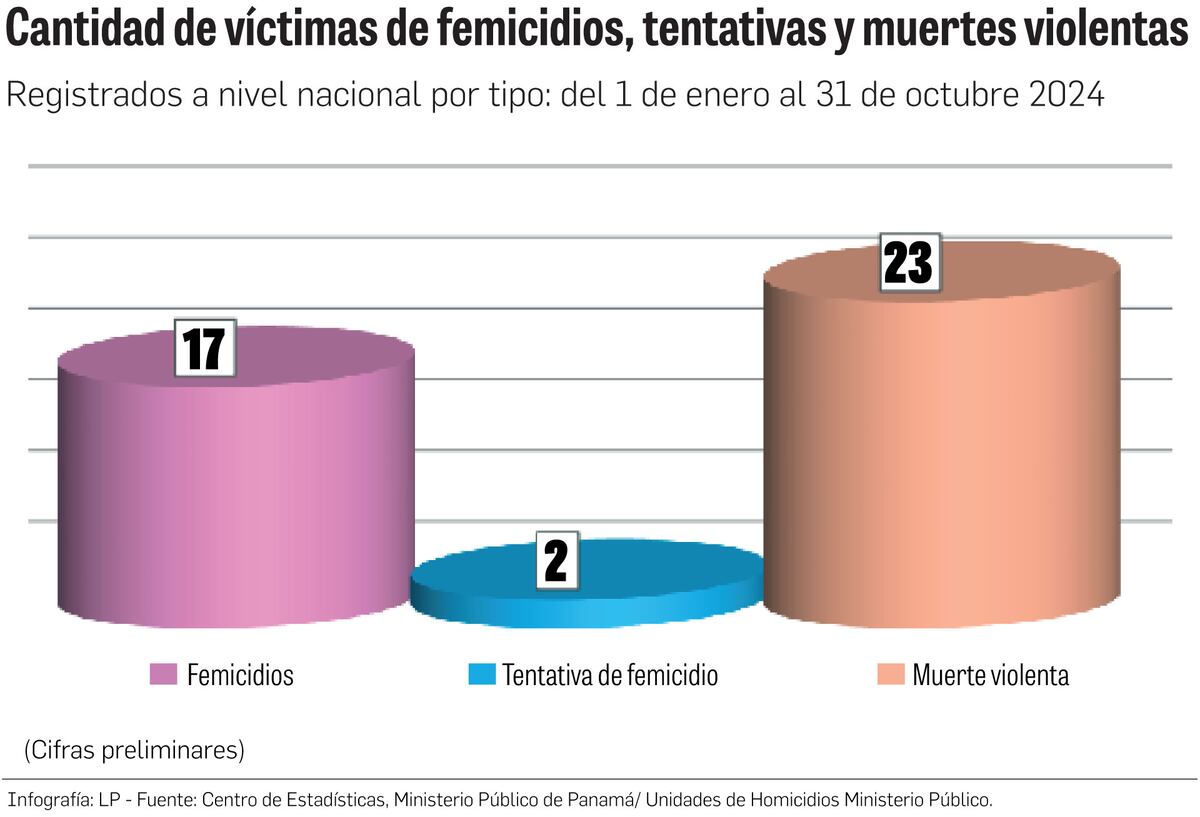 En Panamá, la violencia contra la mujer sigue siendo una preocupante realidad. 23 mujeres han sido asesinadas en circunstancias violentas que vulneraron gravemente sus derechos humanos entre el 1 de enero y el 31 de octubre de 2024. De estos casos, el Ministerio Público (MP) clasificó 17 como femicidios. Además, el Ministerio Público ha recibido 11,000 denuncias de violencia doméstica.