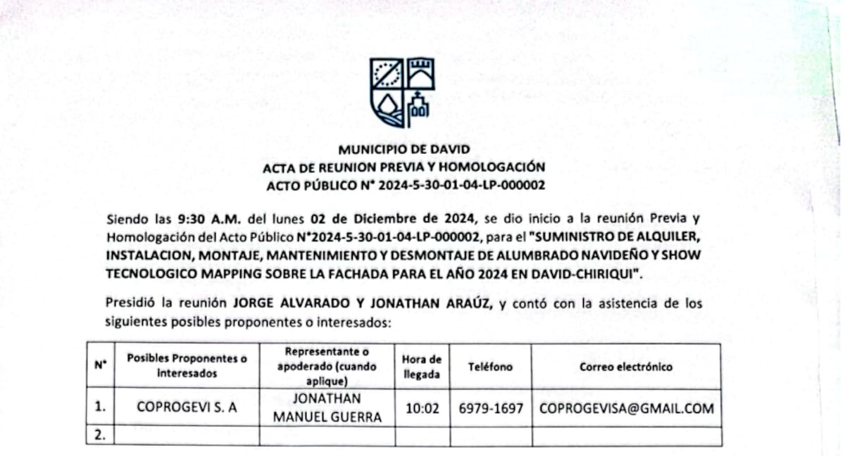 La única empresa que asistió a ese acto de homologación, de acuerdo al acta de reunión del Municipio de David, fue Coprogevi, S.A., cuyo representante es Jonathan Manuel Guerra Vigil.
