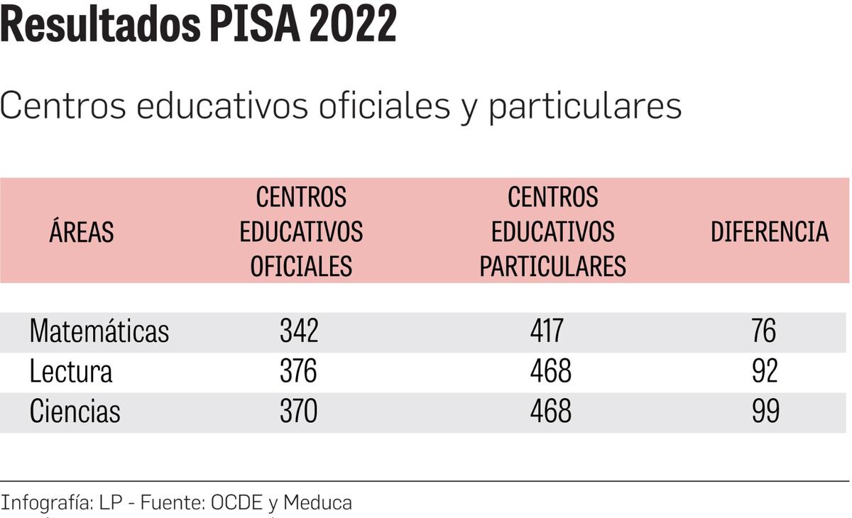 Los resultados del Programa para la Evaluación Internacional de Alumnos (PISA, por sus siglas en inglés) de la Organización para la Cooperación y el Desarrollo Económicos (OCDE) en el 2022 permiten comparar los resultados entre los estudiantes de centros educativos oficiales y particulares.