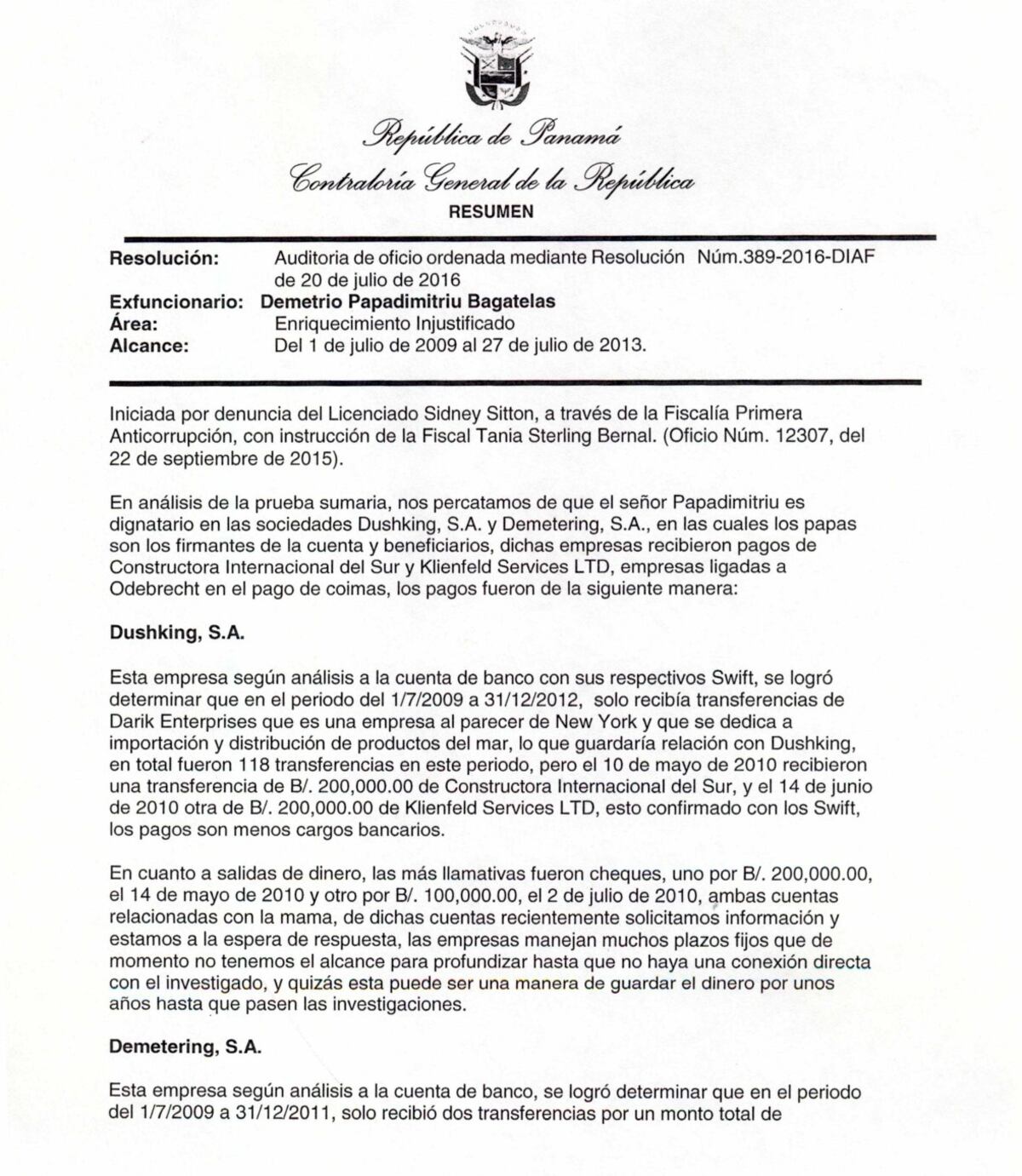 En la denuncia por presunto enriquecimiento injustificado se mencionaban transacciones bancarias a favor de las sociedades Malena Investment, S.A. y Wallis Holding Corp., vinculadas a los padres del exministro Papadimitriu, que habrían recibido en Andorra transferencias de Constructora Internacional del Sur entre septiembre de 2010 y marzo de 2011, por la suma de $900 mil.