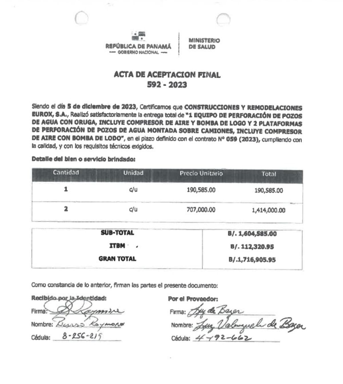 El 5 de diciembre de 2023, Madeline Delgado, directora del subsector de Agua Potable y Alcantarillados Sanitarios (Disapas) del Minsa, certificó haber recibido “a satisfacción” un equipo de perforación de agua sobre orugas, que incluía un compresor de aire y una bomba de lodo, además de dos plataformas de perforación montadas sobre camiones, conforme al contrato, señaló la funcionaria en la nota.
