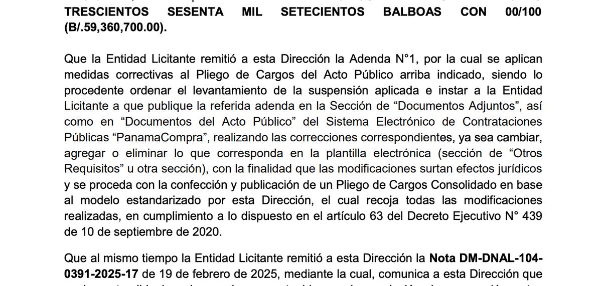 El Meduca también aportó un “certificado de revisión técnica” de la AIG, en el que consta que sus recomendaciones ya fueron atendidas. Precisamente, la ausencia en el pliego de cargos original de “18 puntos relativos a observaciones técnicas” de la AIG fue una de las razones por las que la DGCP suspendió el acto público hace dos días.
