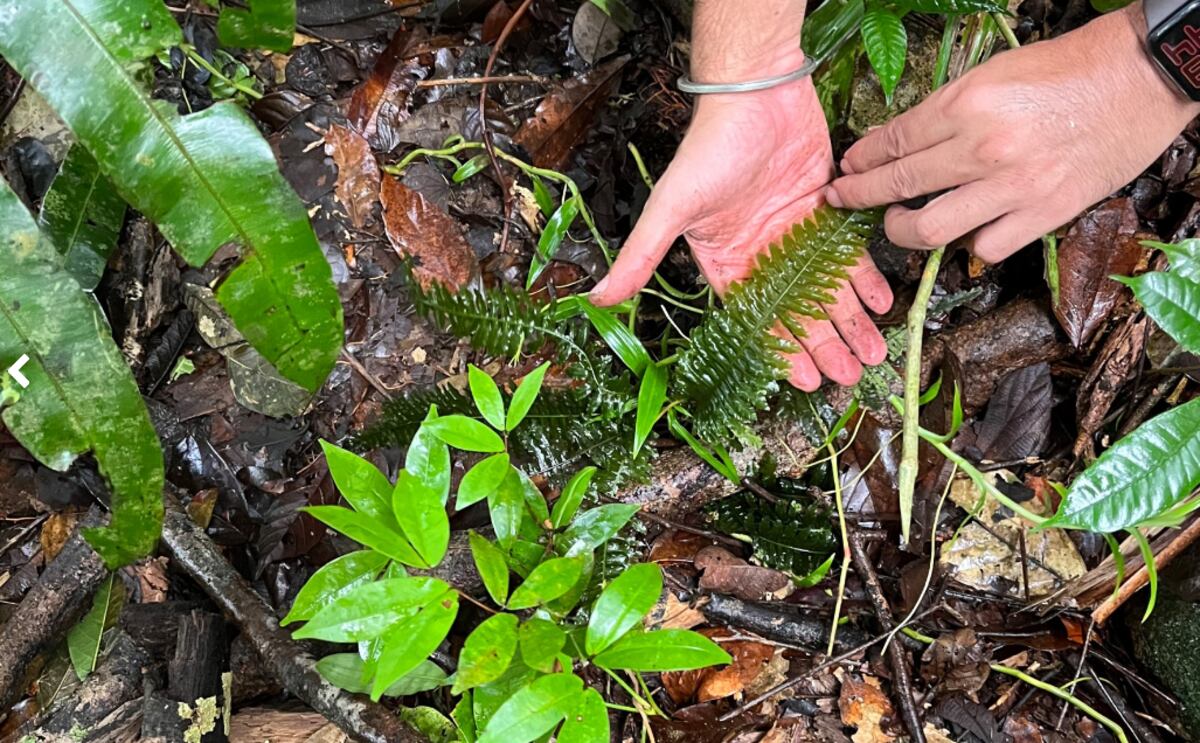 Jorge Valdés, botánico de la Universidad de Panamá, señala un higo estrangulador (Diwa en emberá o Ficus insipida en latín) y lo que los emberá llaman falso higo (Diwapá o Ficus yoponensis). Dice que participar en el proyecto Manené es transformador para los estudiantes de botánica, que rara vez tienen recursos para ir de excursión. Utiliza una herramienta en línea de ForestGEO para identificar los árboles según su especie, así como la experiencia única de los botánicos de STRI Rolando Pérez y Salomón Aguilar. Si conoce la familia del árbol y su ubicación, la herramienta le proporciona una lista de posibles especies de la zona. Esto, sin embargo, es un reto en Balsas, donde muchas especies no están reportadas en Panamá o son desconocidas para la ciencia.