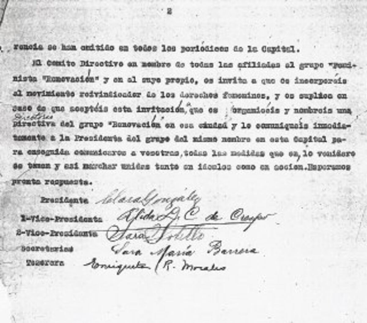 Las manifestaciones individuales pasaron a constituirse en voz colectiva, cuya primera expresión, en diciembre de 1922, fue el manifiesto a las mujeres panameñas del Grupo Feminista Renovación, que al siguiente año fundaría el Partido Nacional Feminista, y que en su primer párrafo decía: “Mujeres panameñas: Ha llegado el momento en que el deber nos impone reclamar el puesto de absoluta igualdad al hombre ante la ley que de hecho nos corresponde. Nosotras, con nuestros esfuerzos y trabajos, ora como madres, ora como profesoras y maestras, ora como obreras, estamos realizando una labor trascendental para el progreso de nuestra nación, y no es justo que esta nación, a la cual hemos consagrado todas las energías de nuestro espíritu y de nuestro cuerpo, nos mantenga en un plano inferior al que ocupa el hombre ante los derechos y responsabilidades de la ley”.