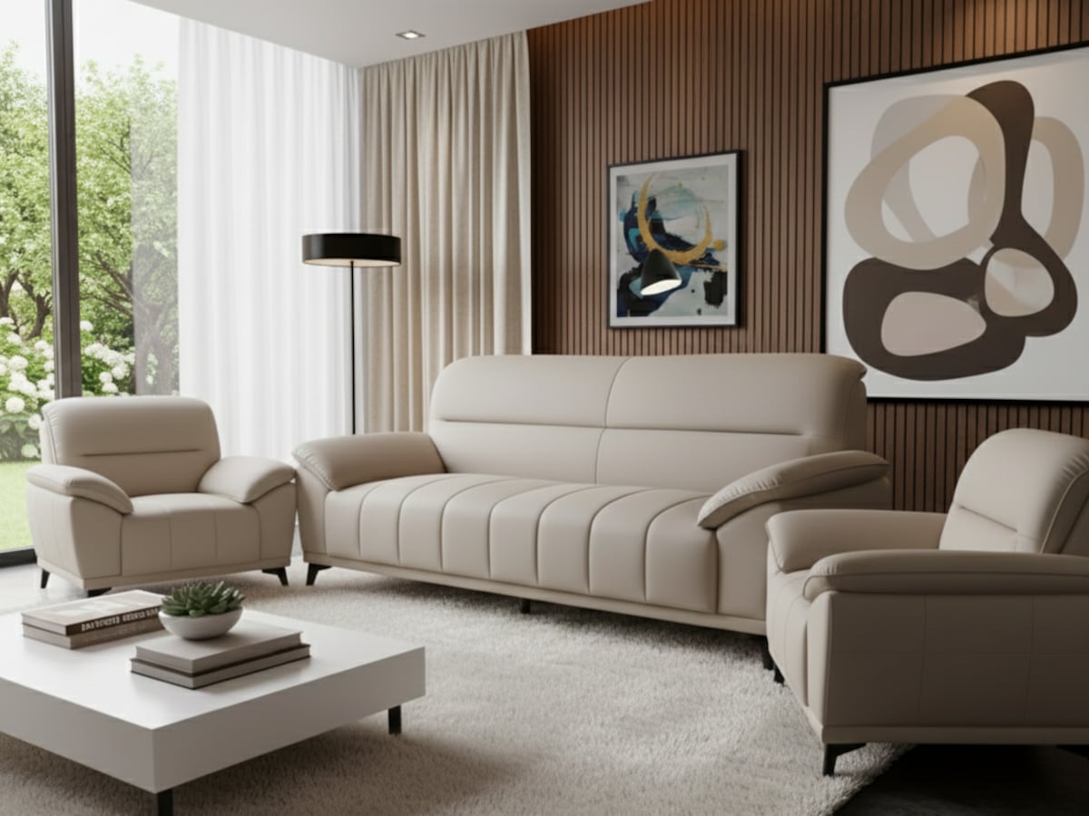 En tono beige con sofá y butacas de líneas amplias y acolchado envolvente. Su diseño moderno y elegante combina confort y estilo, ofreciendo piezas versátiles que elevan cualquier espacio con una estética cálida y sofisticada.