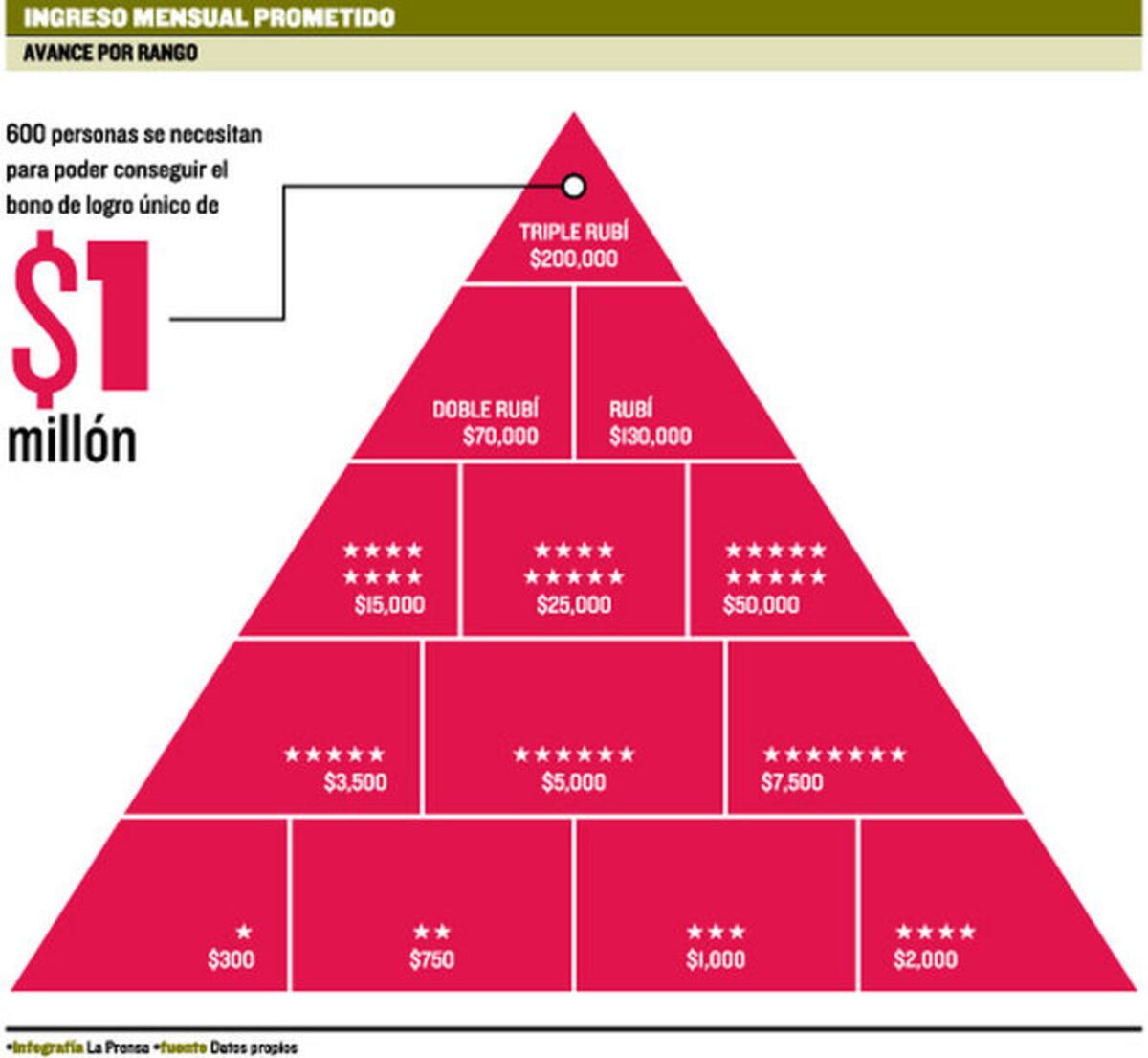 Cuando estas dos personas ingresan a un integrante, entonces el líder del equipo sube de estatus y se convierte en un “dos estrellas”. Y así sucesivamente hasta llegar a las 13 estrellas o al escalón del “rubí”.