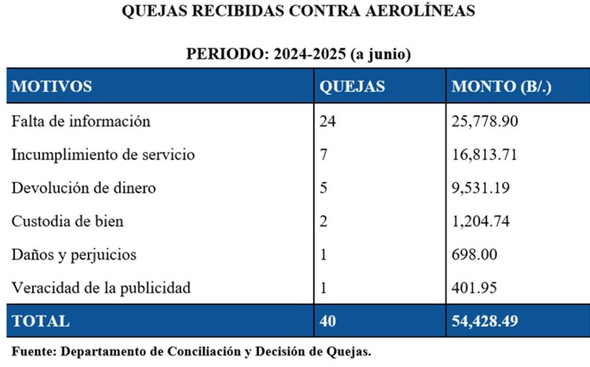Un total de 40 quejas contra diferentes aerolíneas que operan en Panamá, ha recibido la Autoridad de Protección al Consumidor y Defensa de la Competencia (Acodeco).