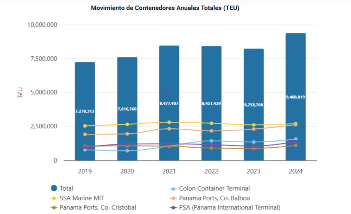 En 2024, los puertos panameños movieron casi 9.5 millones de TEU —contenedores de 20 pies—, una cifra que evidencia la magnitud de la actividad portuaria en el país.