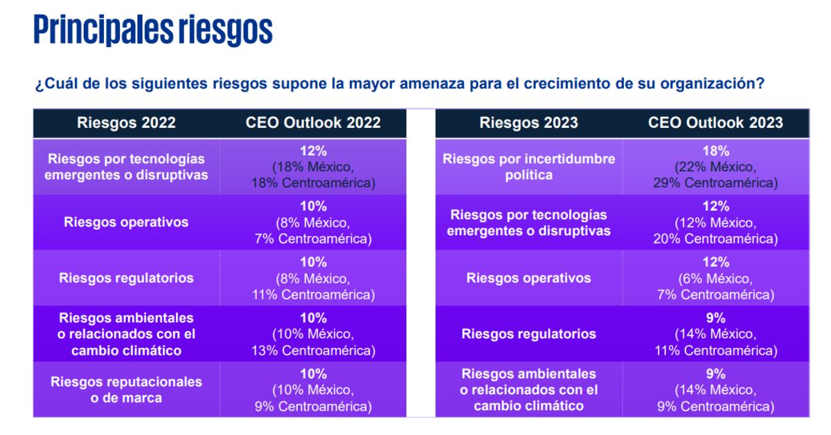 “A medida que las organizaciones se adaptan para llevar a cabo sus estrategias, la planificación se ha vuelto cada vez más compleja a causa de la naturaleza impredecible de la geopolítica, que en 2023 es considerada como la mayor amenaza para el crecimiento de los negocios”, advirtió Víctor Esquivel, socio director General de KPMG México.