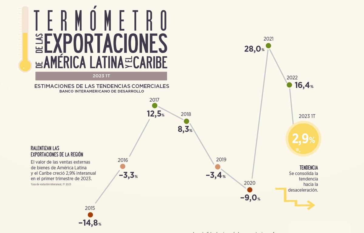 En el primer trimestre de 2023 el valor de las exportaciones de América Latina y el Caribe se expandió 2.9%, lo que demuestra un proceso de desaceleración, tras aumentar 16.4% en 2022.