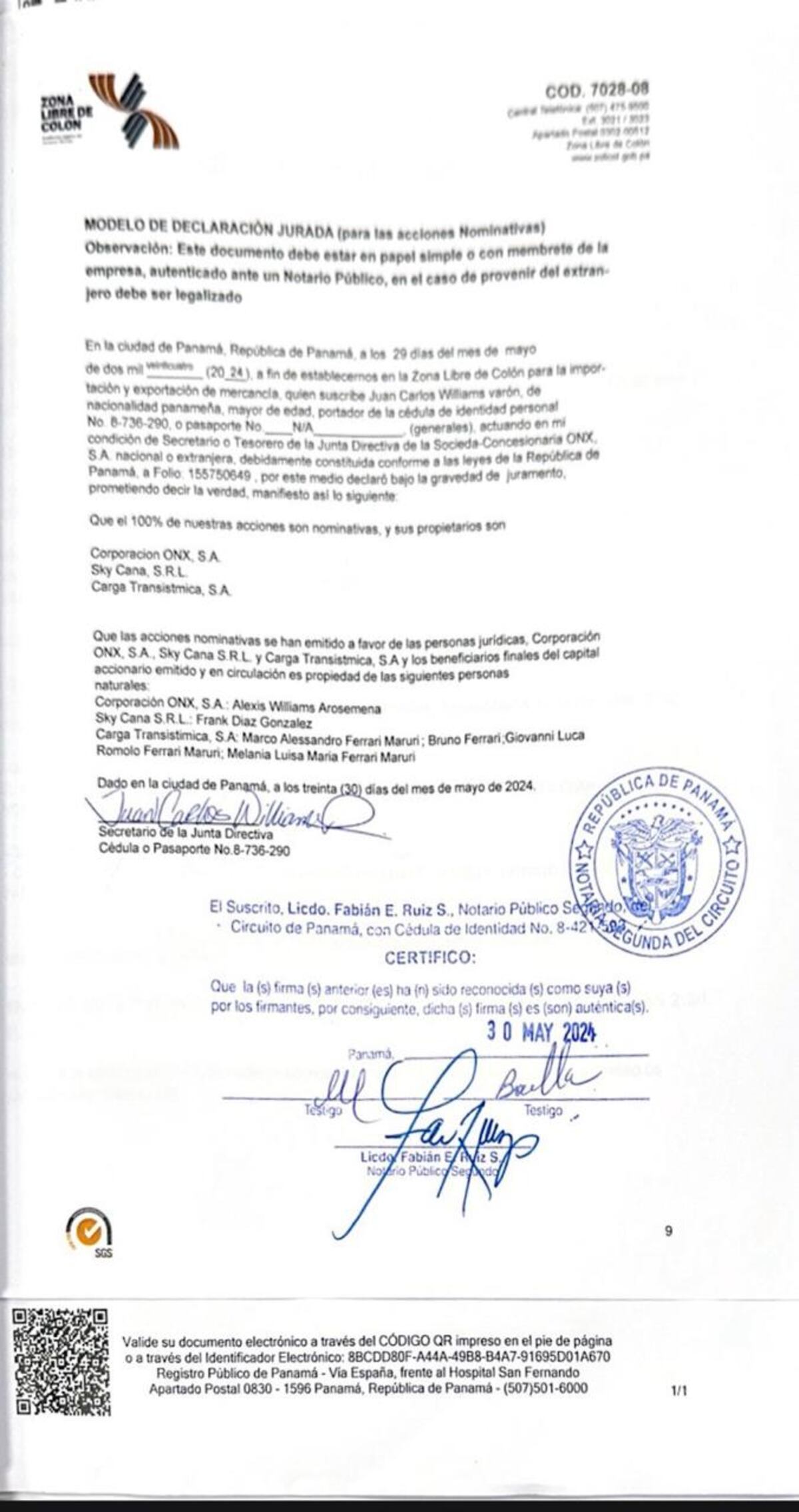 En una carta notariada el 30 de mayo de 2024, el secretario de Concesionaria ONX, Juan Carlos Williams, declaró bajo juramento que los beneficiarios finales de Carga Transístmica son Marco, Bruno, Giovanni y Melania Ferrari Maruri.