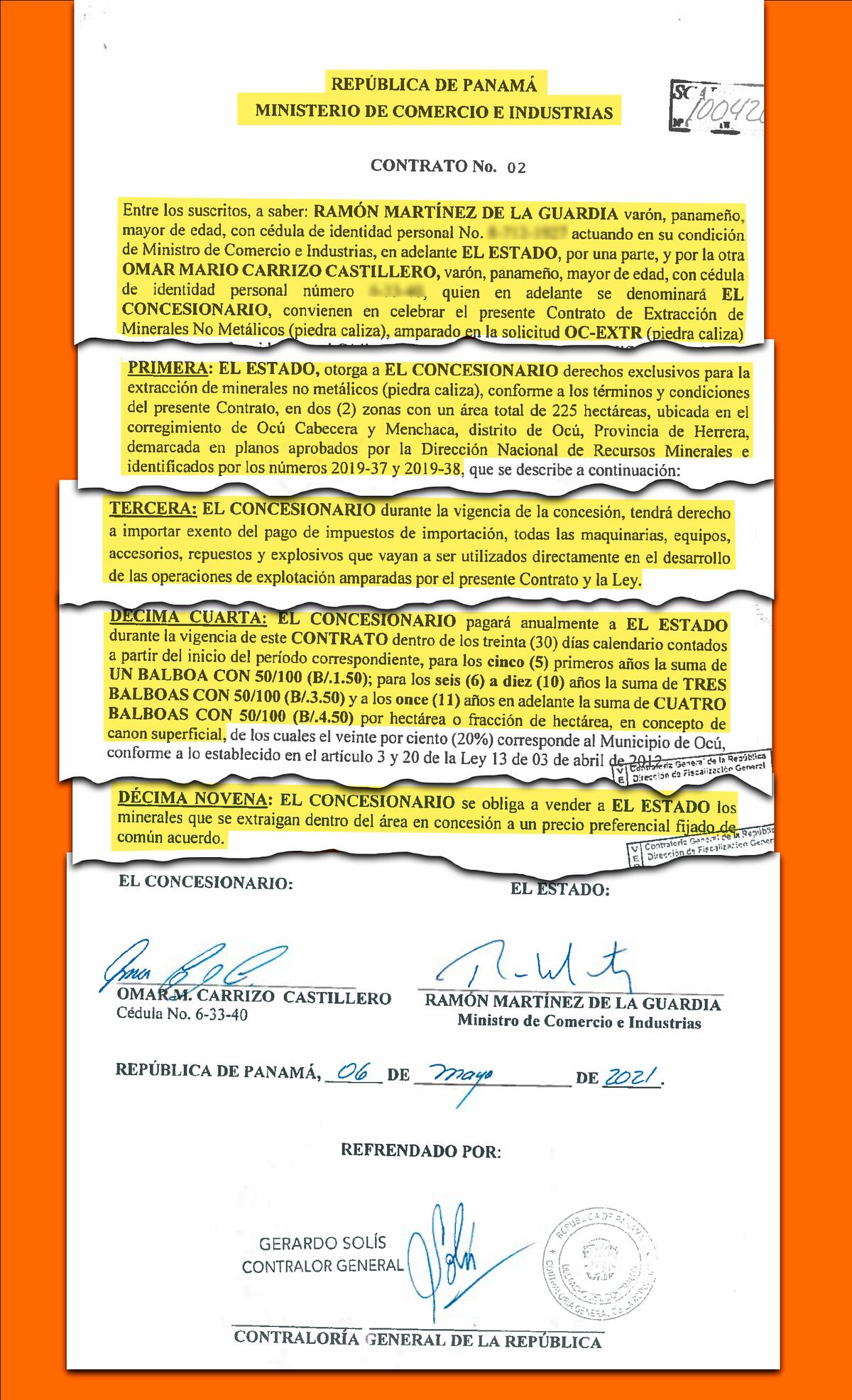 La concesión para extraer minerales no metálicos fue otorgada mediante el Contrato No. 2 del 4 de enero de 2021, firmado por el entonces ministro de Comercio e Industrias, Ramón Martínez (actual embajador de Panamá en Estados Unidos), y Carrizo, quien firmó a título personal. El contrato fue refrendado por el contralor Gerardo Solís el 6 de mayo de ese mismo año.