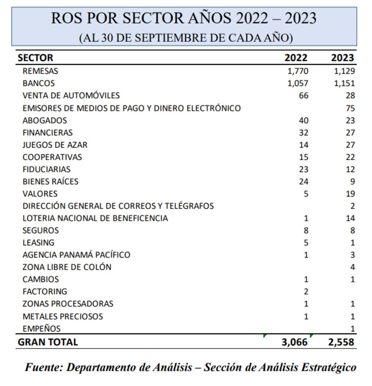 También hay reportes de operaciones sospechosas en procesos de venta de automóviles con 28 casos, juegos de azar 27, financieras otros 27 casos, de bufetes de abogados 23, cooperativas 22 y del mercado de valores 19, además de otros sujetos no financieros como bienes raíces, zona libre de Colón.