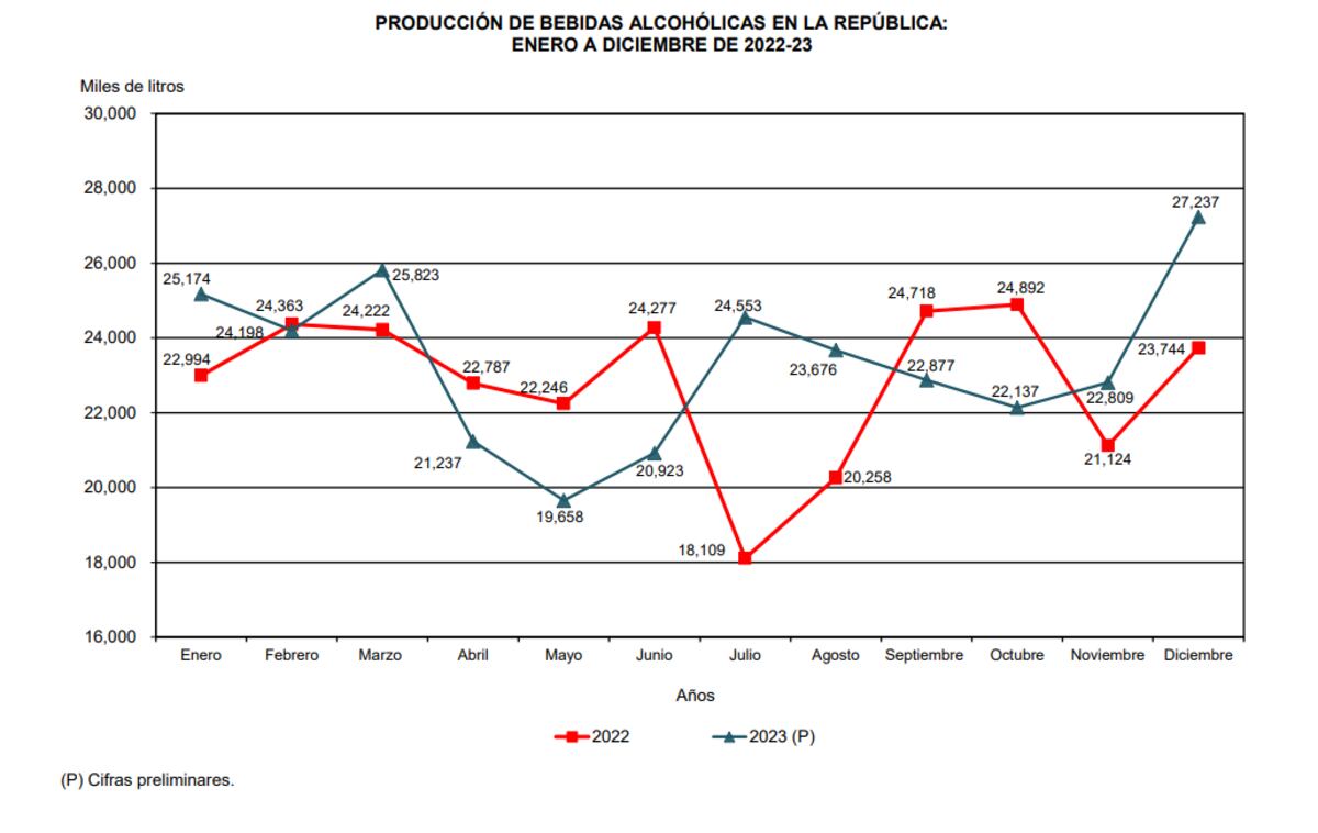 Para los meses de noviembre y diciembre, la producción de bebidas alcohólicas se incrementa debido al aumento del consumo como resultado de las celebraciones de fiestas patrias y de fin de año.