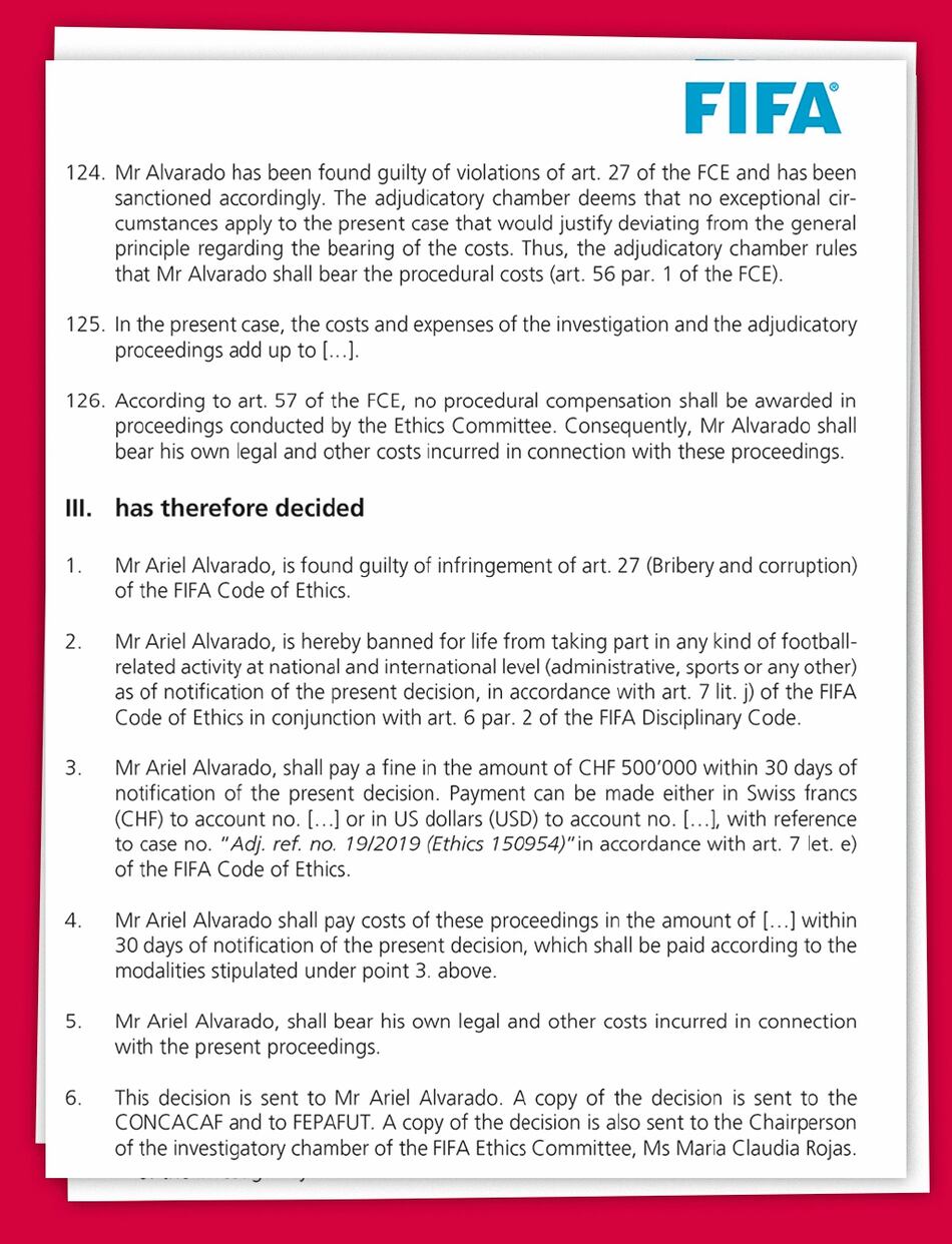 En el veredicto, el órgano de decisión consideró que Alvarado “incumplió el artículo 27 (cohecho y corrupción) del Código de Ética del máximo órgano rector del fútbol”.