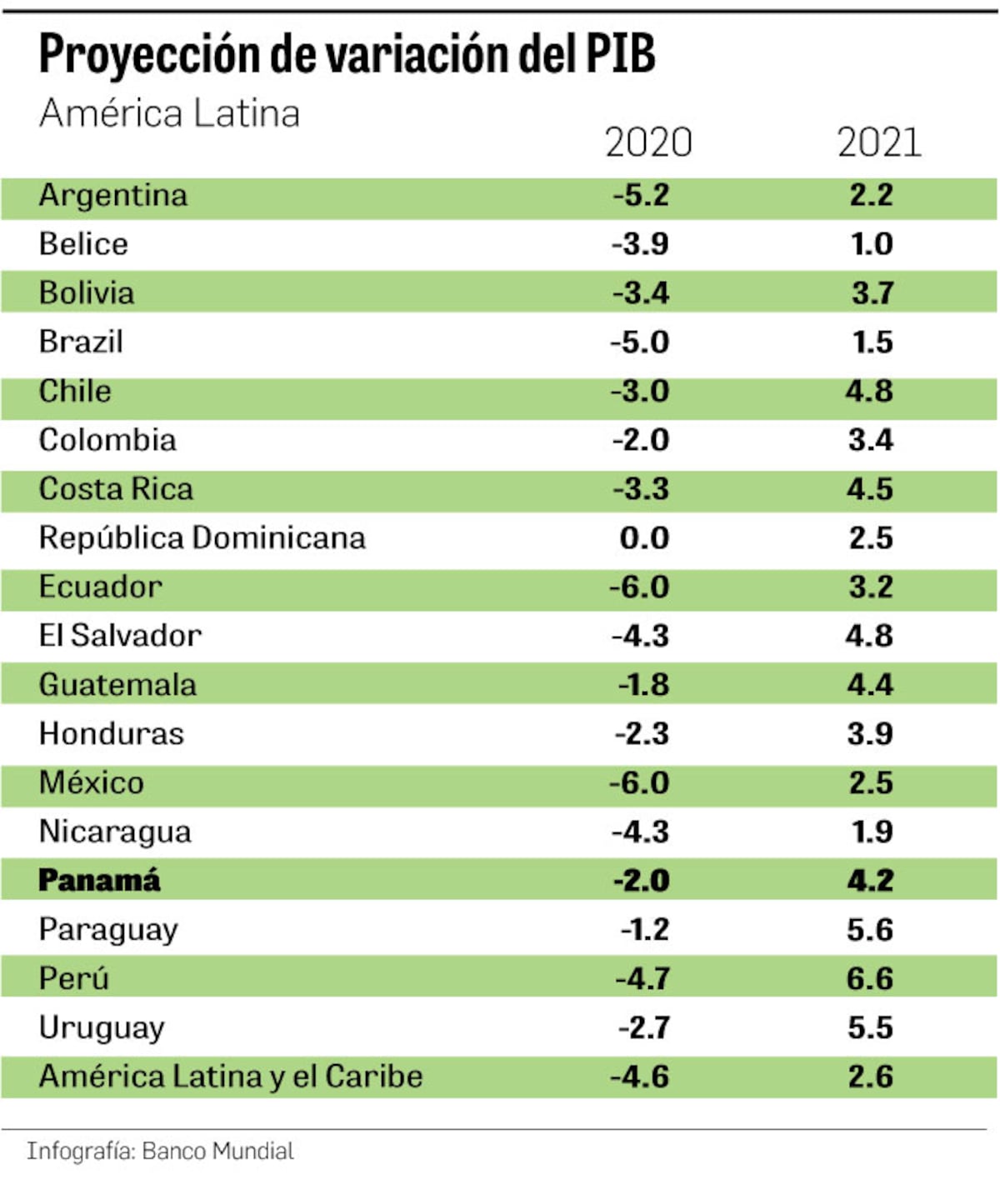 Para Panamá, el banco prevé una caída del PIB de 2%. “A pesar de unos fundamentos económicos sólidos, la economía tendrá un crecimiento negativo en 2020 por los efectos del coronavirus, ya que Panamá tiene vínculos significativos con la economía global y sectores generadores de empleo como la construcción y los servicios se ven afectados”, dijo la entidad en su reporte.