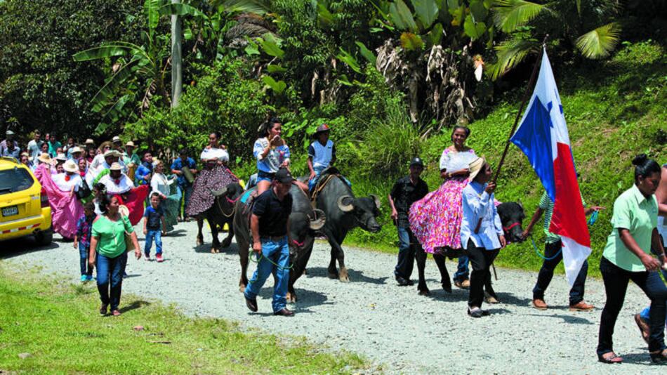 Un tamborito acompaña a la realeza que viaja sobre los búfalos. Recorre los caminos de piedra del pueblo y cruza el parque, oficinas, casas, puentes, la escuela, la abarrotería, hasta llegar al galpón del sudor.