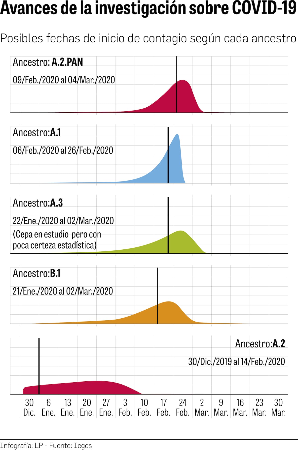 Otros análisis también arrojaron que la cepa A1 (Estados Unidos) llegó entre el 6 de febrero y el 26 de febrero, es decir, un poco antes del A2PAN; y la B1 (Italia), entre el 21 de enero y el 2 de marzo. (Ver gráfica).