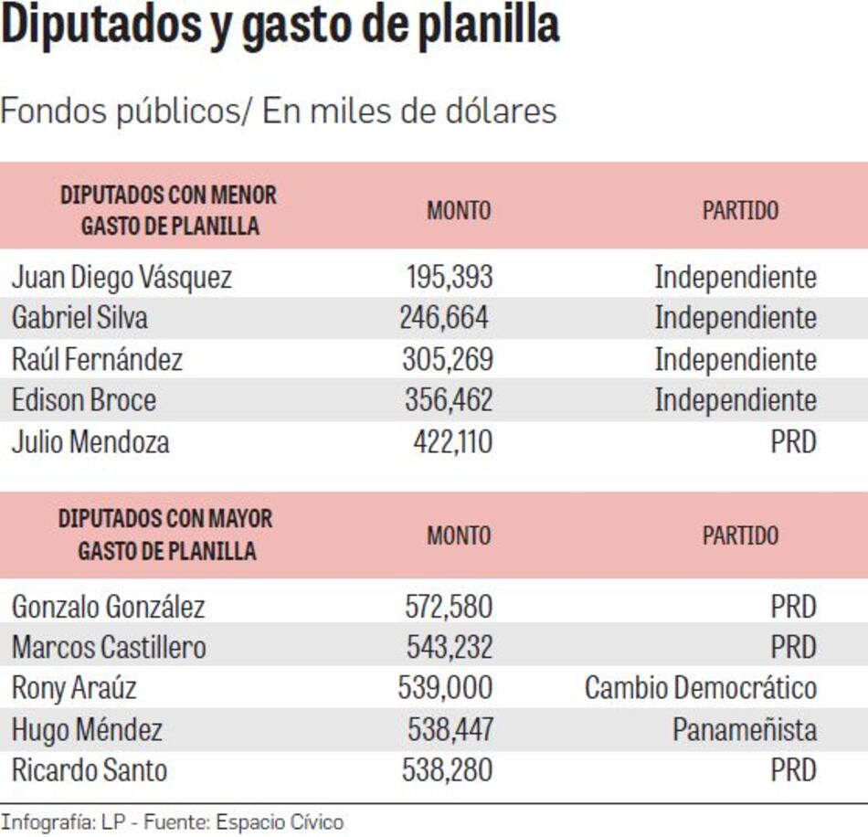 El récord de los más gastones lo tiene el perredista Gonzalo González ($572 mil 580), diputado que tiene a 11 personas dentro de su planilla. Le sigue el expresidente de la Asamblea Marcos Castillero, del PRD. El político tiene a 20 personas en planilla, lo que ha implicado un gasto de $543 mil 232.