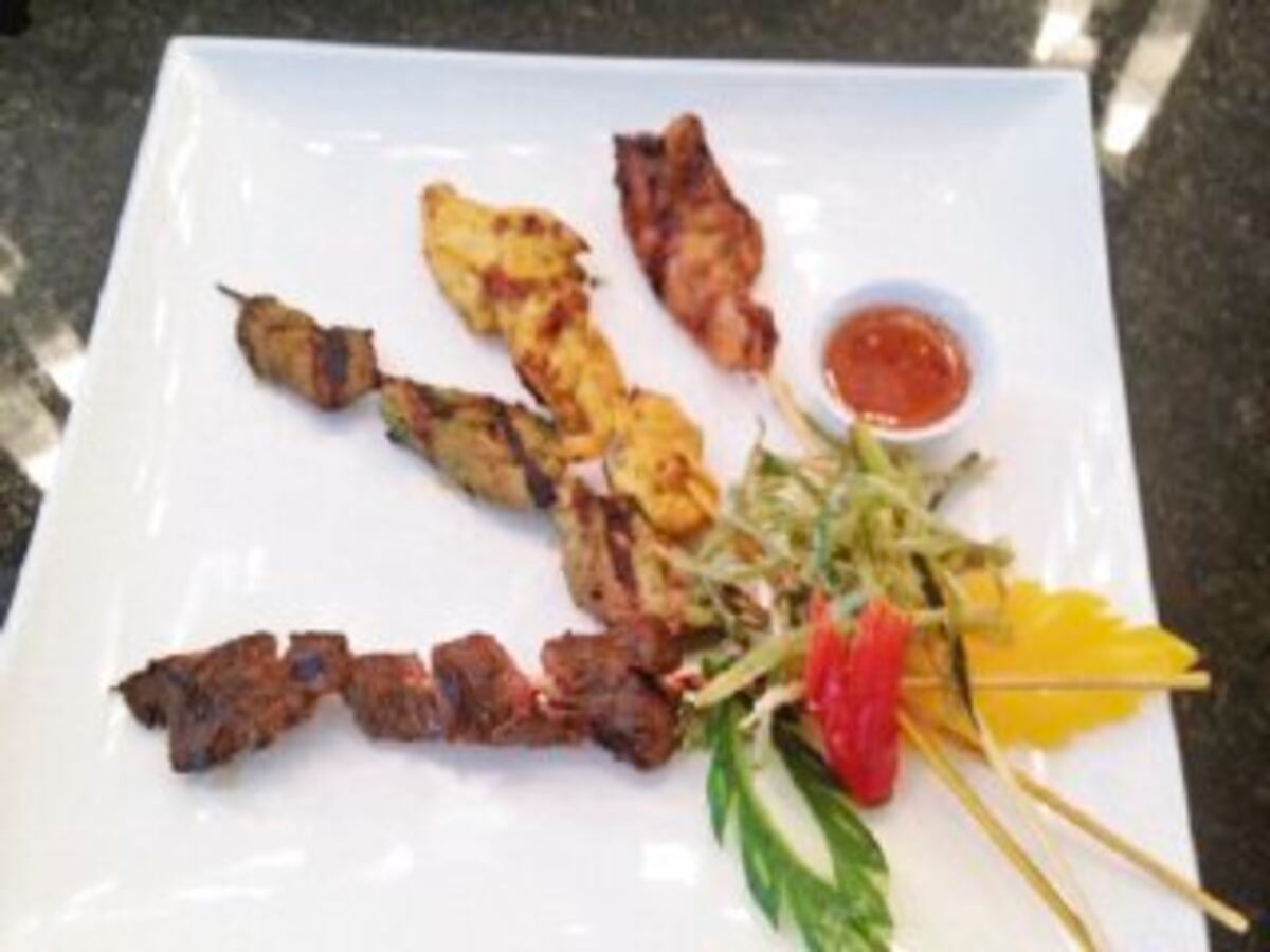 Se prepara la salsa de barbacoa. Se parte un filete grande en cuadritos medianos y se adoba con 1 cucharada de sal, 2 cucharaditas de pimienta, 3 cucharadas de salsa china y 3 cucharadas de salsa inglesa.