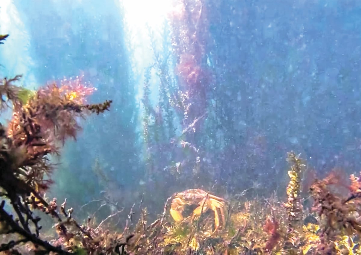 Un cangrejo intenta atrapar con sus pinzas a este intruso indiscreto, las medusas emergen a la superficie mientras bancos de peces pasan tranquilamente por debajo, los moluscos se aferran a los pilotes y las algas de todos los colores se balancean con la corriente.