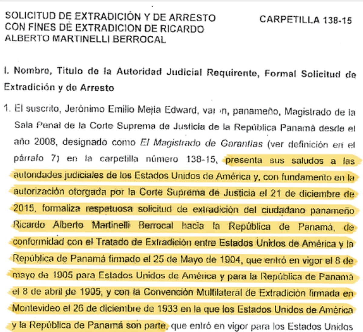 En el documento al que tuvo acceso este medio, Mejía también solicita a las autoridades de EU “respetuosamente el arresto para los propósitos de extradición hacia la República de Panamá del ciudadano de nacionalidad panameña Ricardo Alberto Martinelli Berrocal”.