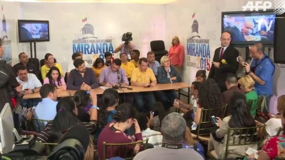 La madrugada de este lunes 7 de diciembre, la presidenta del Consejo Nacional Electoral, Tibisay Lucena, anunció que la alianza opositora Mesa de Unidad Democrática (MUD) había logrado 99 curules en las elecciones legislativas que se celebraron el domingo 6. El oficialista Partido Socialista Unido de Venezuela (PSUV) sumaba 46 escaños y, a esa hora, Lucena informó que faltaban por adjudicar 22 curules.