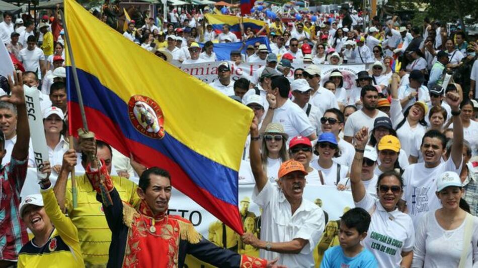 Vestidos unos con camisetas blancas y otros con las amarillas de la selección nacional de fútbol, los manifestantes, que llevaban banderas de Colombia, globos y pancartas, partieron del Templo Histórico de Villa del Rosario, al lado de Cúcuta,capital del departamento de Norte de Santander, ambas ciudades colindantes con las venezolanas de San Antonio y Ureña, en el estado de Táchira.