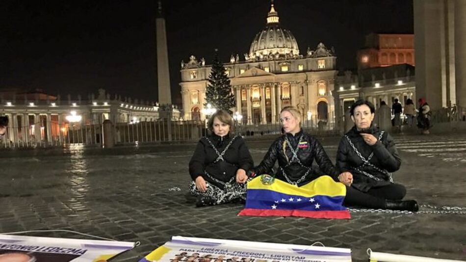 Lilian Tintori, esposa del opositor venezolano Leopoldo López, se encadenó frente al Vaticano para pedir la liberación de su marido y "todos los presos políticos" de Venezuela.