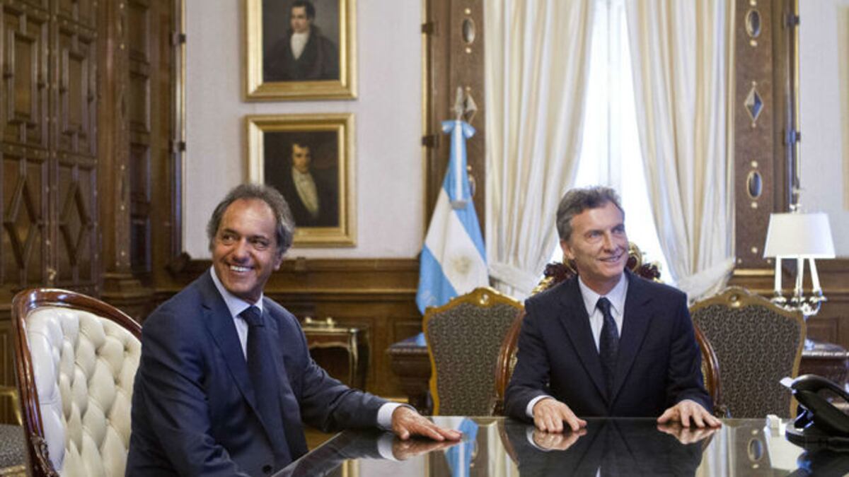 El ex gobernador bonaerense, respaldado por la expresidenta Cristina Fernández (2007-2015) para enfrentar a Macri en los comicios, intenta diferenciarse de la dirigente peronista con quien en varias ocasiones ha tenido desencuentros y es de prever que intentará ocupar un espacio de influencia dentro del peronismo, donde conviven distintas corrientes que se disputan el poder. El ministro del Interior Rogelio Frigerio, que asistió al encuentro en la sede de gobierno, señaló a su vez que “está tomada la decisión política” para discutir un nuevo esquema fiscal que impulse un “mayor federalismo” entre las provincias. Dijo además que ambos dirigentes hablaron de las coincidencias que tuvieron en la campaña electoral “para trabajar en una agenda en el Congreso que permita encontrar soluciones concretas a los problemas”. Macri tendrá que lograr consensos en el Parlamento ya que el peronismo tiene mayoría en el Senado y es el bloque mayoritario en la Cámara de Diputados. En la conversación se abordó además una reforma política que contemple un sistema electoral más moderno, la lucha contra el narcotráfico, la independencia de la justicia y la recuperación del crédito internacional. Scioli dijo que otros desafíos son mejorar los ingresos de los jubilados y lograr que los trabajadores puedan mantener el poder adquisitivo con sus salarios. “Hay que dar muestra de convivencia. Si en algún momento mi presencia puede contribuir a dar imagen de mayor confianza, allí me van a encontrar”, señaló Scioli, quien durante su carrera política mostró un talante conciliador. Macri dijo tras jurar como presidente en el Congreso que pretende superar la etapa de confrontación política de la que responsabilizó a su antecesora y lograr la unidad de los argentinos. Instó a todos los sectores “a aprender el arte del acuerdo” y dijo estar dispuesto a recibir “el aporte de todos... peronistas y antiperonistas”.