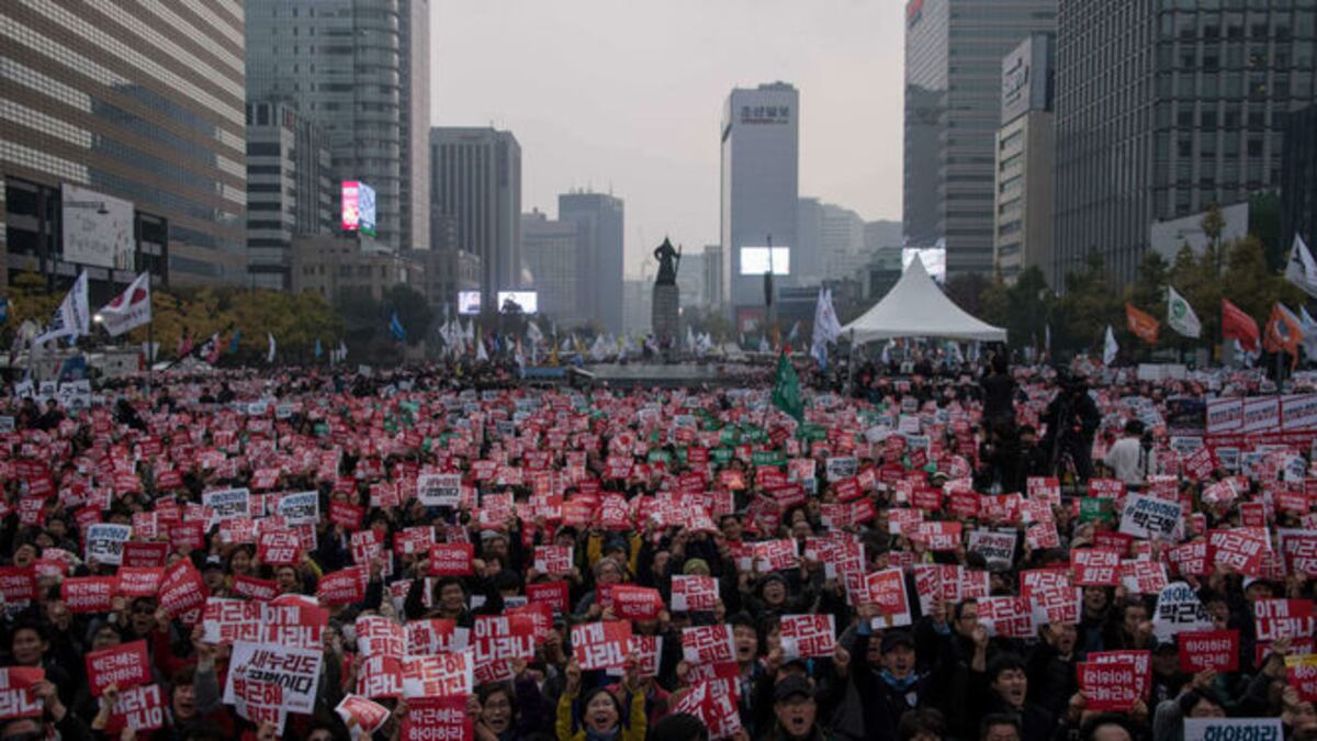 Portando pancartas, velas y letreros coloridos que decían "Park Geun-hye fuera" y "Traicionados por un gobierno secreto", los manifestantes llenaron una plaza enorme frente a una antigua puerta del palacio así como las calles cercanas, coreando lemas y aplaudiendo por los discursos de los oradores que pidieron la salida de la presidenta, cada vez más impopular.