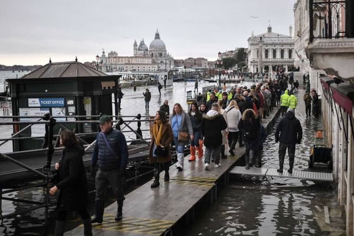 La marea del martes, combinada con fuertes ráfagas de viento y copiosa lluvia, prácticamente sumergió al 80% de la ciudad, según el gobernador de la región Luca Zaia. Una persona falleció electrocutada en su casa.