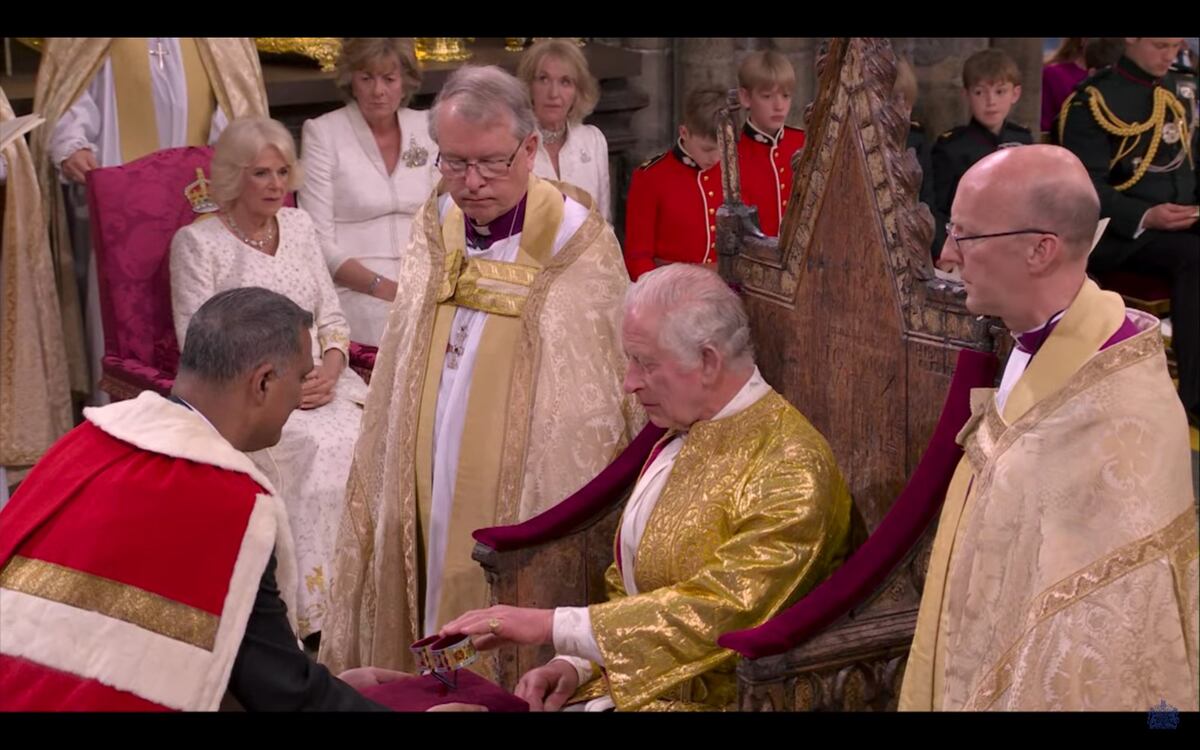 El arzobispo de Canterbury, asistido por el deán de Westminster y el arzobispo de York, ungió con aceite las manos, pecho y frente de Carlos III, que ascendió al trono al morir su madre, Isabel II, el 8 septiembre, y hoy recibe oficialmente los símbolos de su poder.