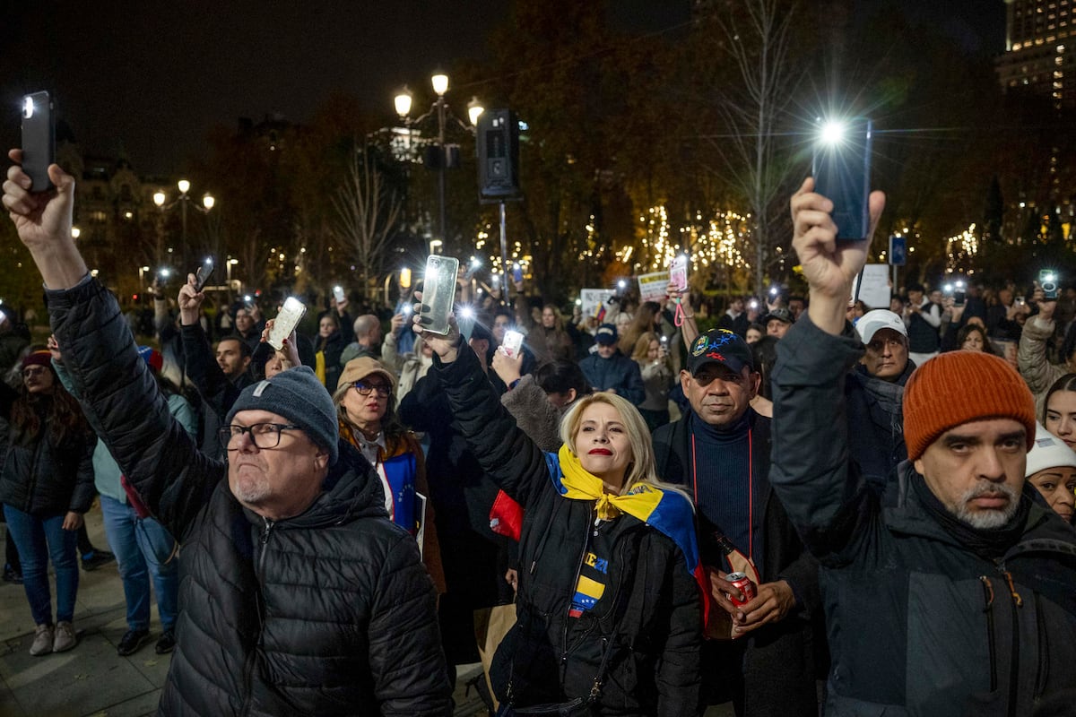 “El Nobel es de 30 millones de venezolanos”, “Paz y libertad en Venezuela” o “Maduro podrido” fueron algunos de los mensajes que portaron los asistentes, que recordaron especialmente a los presos en el país sudamericano, con carteles que mostraban las caras y los nombres de algunos de los detenidos en cárceles venezolanas.