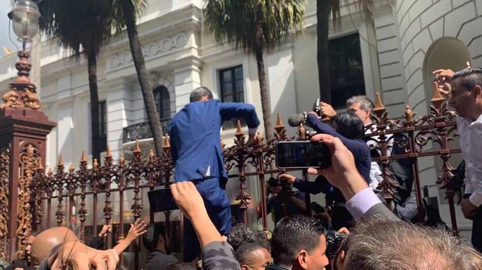Guaidó y varios diputados de la mayoría opositora legislativa no pudieron ingresar al Palacio Legislativo debido a piquetes policiales y militares, entre más de cuatro horas de forcejeos.