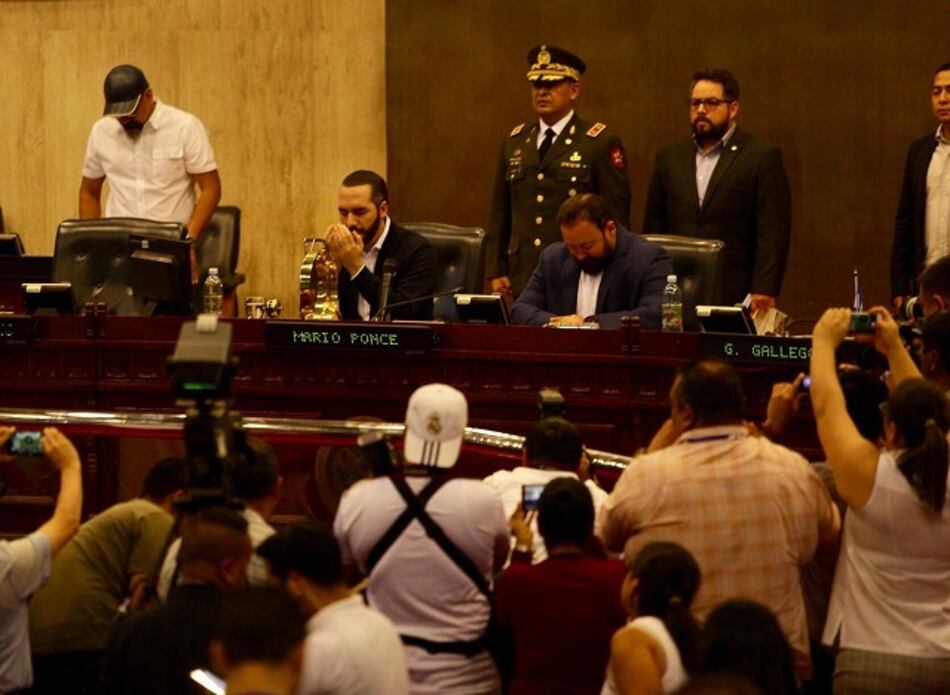 Momentos antes de hacer el ultimátum, Bukele ingresó en un hecho insólito al estrado que normalmente ocupa la directiva del Congreso en el salón de sesiones y se dispuso a orar: "La decisión que vamos a tomar ahora la vamos a poner en manos de Dios. Vamos hacer una oración", dijo.