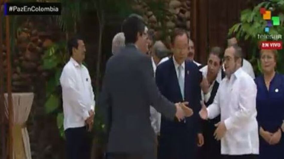 Santos y el líder de las FARC Timoleón Jiménez se saludaron antes de firmar el cese el fuego en Colombia.