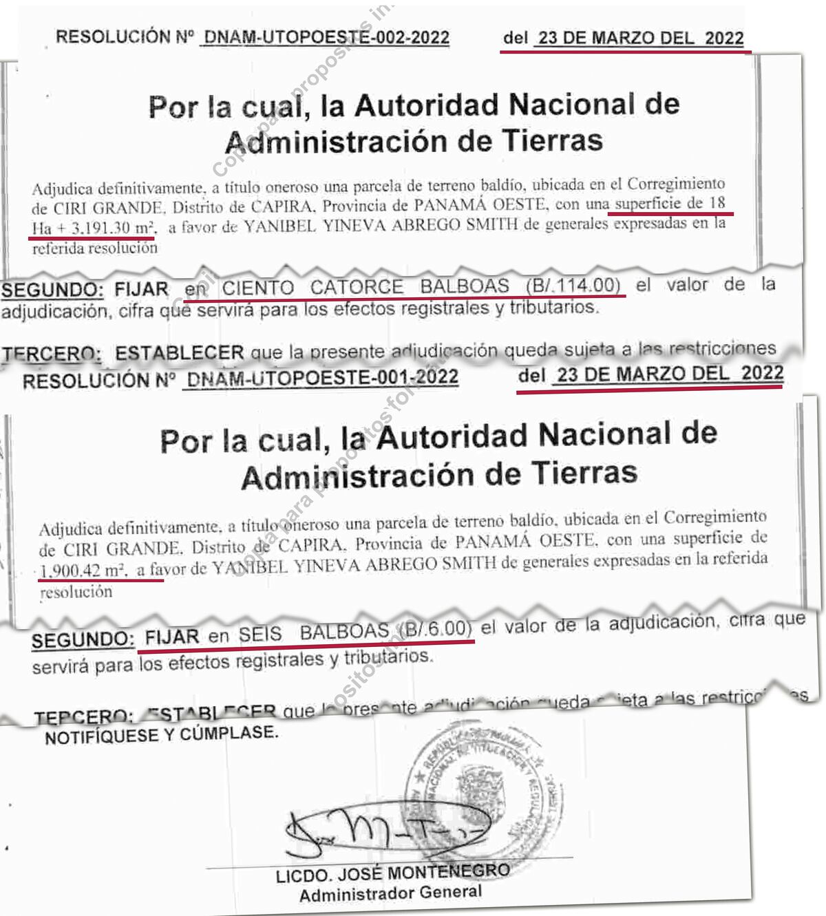 Vergara aseguró que las tierras que Ábrego “compró a un ciudadano” en Cirí Grande forman parte de un “barrido catastral que hizo la Anati”, como parte de la Ley Especial de Titulación Masiva de 2006. Pero la entrega casi gratuita de las 18.4 hectáreas de tierras nacionales fueron firmadas únicamente por Montenegro, pese a que Anati cuenta con los directores Nacional de Titulación y Regulación, Damián Cigarruista, y de Adjudicación Masiva, Roberto Lide.