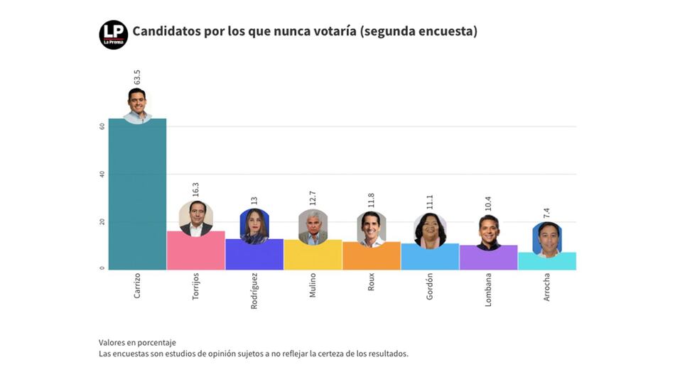 En cambio, se observa una disminución en la cantidad de encuestados que ha dicho que nunca votaría por Martín Torrijos (postulado por el Partido Popular), José Raúl Mulino (de Realizando Metas y Alianza), Rómulo Roux (de Cambio Democrático y el Panameñista), Ricardo Lombana (Movimiento Otro Camino o Moca) y de los aspirantes por la libre postulación Maribel Gordón y Melitón Arrocha.
